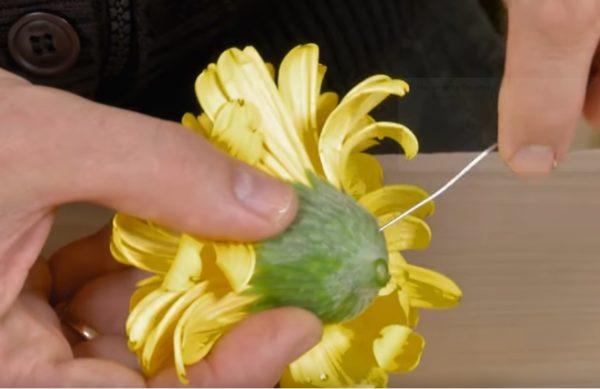 Lo primero que tenemos que hacer es cortar el tallo a raíz del cáliz de la flor. Con mucho cuidado cogeremos un alambre de unos 15 cm de longitud y traspasaremos el cáliz de la flor de un extremo a otro.