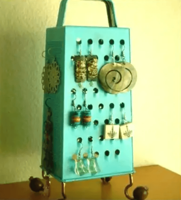 ¿Tienes un rallador viejo en tu cocina? ¡No lo tires! Como tiene agujeros, puedes hacer un joyero sencillo para colgar los aretes. Solo tendrías que restáuralo y pintarlo con tu color favorito.