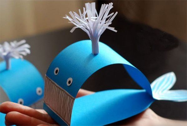 Hacer una divertida ballena es posible si tenéis un poco de cartulina azul en casa. Para hacer una ballena como la que veis arriba, tan solo vais a necesitar cortar una cartulina grande de tal manera que podáis doblar y hacer el arco como vemos en la foto. En caso de que no os salga, recortáis una pieza de base y hacéis el arco con otra pieza suelta. Solo tendréis que pegarla y sumarle además la cola.