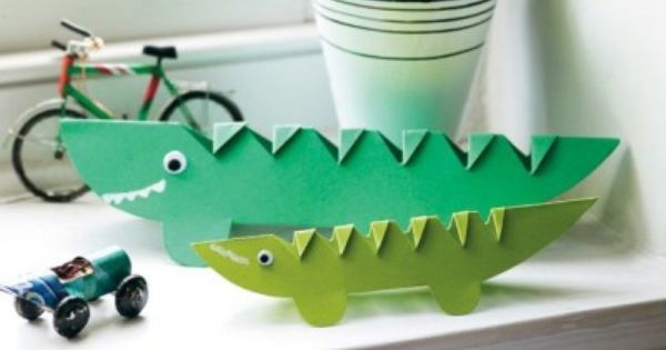 Otra de las manualidades de animales que los niños pueden hacer con una cartulina, es estos cocodrilos que veis arriba. Para hacerlos necesitaremos cartulinas de color verde, que debemos recortar en forma circular, doblamos por la mitad y cortamos el borde para crear las escamas (haciendo cortes triangulares). Luego cortamos cuatro piezas para hacer las patas del cocodrilo y añadimos además un ojo adhesivo y pegamos también una boca con dientes en cartulina blanca (o la pintamos).