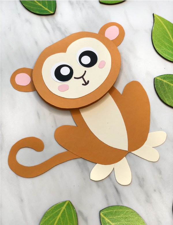 Los niños pueden hacer también este monito que veis arriba. Para hacerlo solo se necesita cartulina de color marrón, blanco y rosa y dibujamos sobre estas, las distintas piezas para formar el monito que estará sentado. La cara es solo una circunferencia en marrón y luego en blanco, el cuerpo lo podemos hacer dibujando en la cartulina marrón y le pegamos una pieza en blanco en el centro para que sea el pecho. Luego cuando tengamos pegada la cabeza y el cuerpo, tan solo faltará pegar las patas, la cola y las orejas, así como los detalles de la cara.