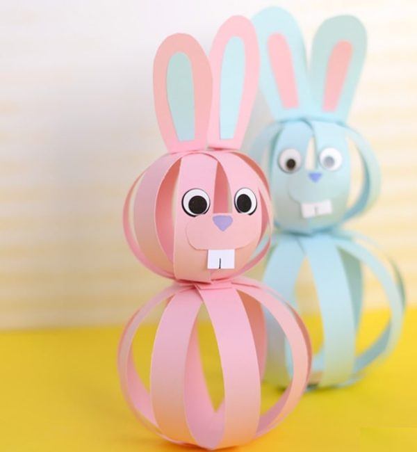 También con un poco de cartulina podemos hacer estos divertidos conejitos. Para ello necesitarás cortar 4 tiras de cartulina del mismo tamaño. Pegas dos por el centro formando una cruz y luego las otras dos las cruzas y pegas también en el centro. Ahora unes las tiras por los extremos de modo que te quede una bola como un copo de nieve. Repites con otras cuatro tiras (más largas) y ya tendrás entonces el cuerpo del conejo. Pegas encima la primera bola que hiciste que será la cabeza. Ahora solo faltará acabar los detalles del conejito, pegando piezas de cartulina formando los ojos, la nariz, los dientes y también, las orejas del conejo.