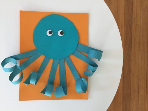 ¿Queréis hacer un pulpo para que los niños se diviertan? Podemos crearlo con un poco de cartulina de color azul tal y como vemos en esta otra manualidad en la foto de arriba. Para ello, recortamos un trozo de cartulina dándole forma circular. Luego tendremos que cortar 8 tiras iguales de cartulina y enrollamos uno de los extremos para que nos queden como si fueran los tentáculos del pulpo. Pegamos cada tentáculo al círculo de cartulina (por detrás) y luego solo necesitaremos pegar unos ojos adhesivos o si lo preferimos, los podemos pintar. Ahora nuestro pulpo ya estará listo o si queremos, podemos pegarlo sobre otra cartulina más grande para hacer, por ejemplo, un mural de animales marinos.