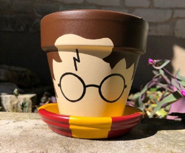 Otra bonita manualidad de Harry Potter que podemos hacer con los niños es esta que consiste en coger una simple maceta y la pintamos de modo que podamos representar el pelo y las gafas de Harry. Además, podemos usar el plato que suelen tener las macetas para almacenar el agua, con los colores de la bufanda que suele llevar el personaje.